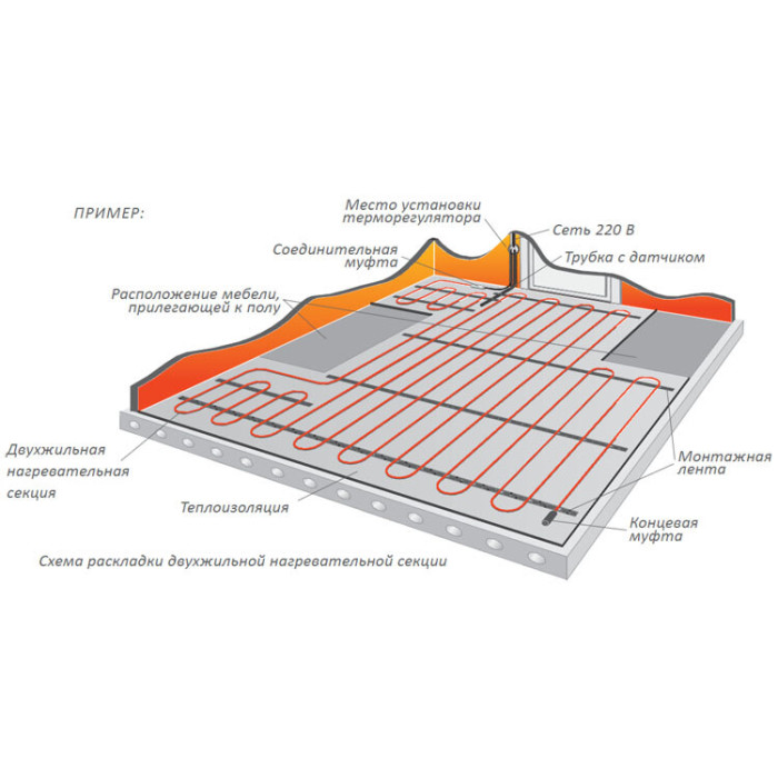 Двожильна нагрівальна секція, монтується в стяжку від 3см до 5 см., з кроком укладання 10 см (основне обігрів) - 12,5 см (комфортне обігрів).