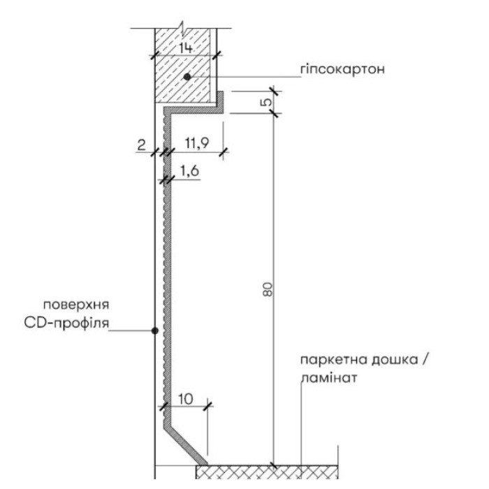 Встановлюється плінтус у заздалегідь підготовлену нішу в гіпсокартонній перегородці або фальш-стіні.