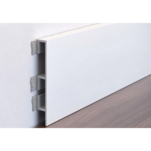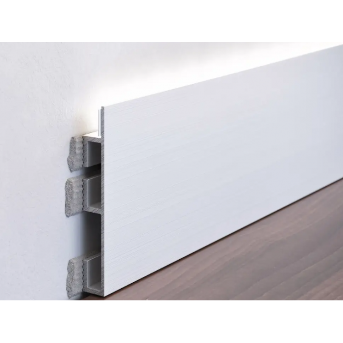 • Міцність. Алюмінієвий плінтус виготовляється з легованого сплаву, який на порядок міцніший за такі матеріали як МДФ, ПВХ, поліуретан та ін. Плінтус з алюмінію буде більш стійкий до появи подряпин і деформацій від ударів у процесі експлуатації. >