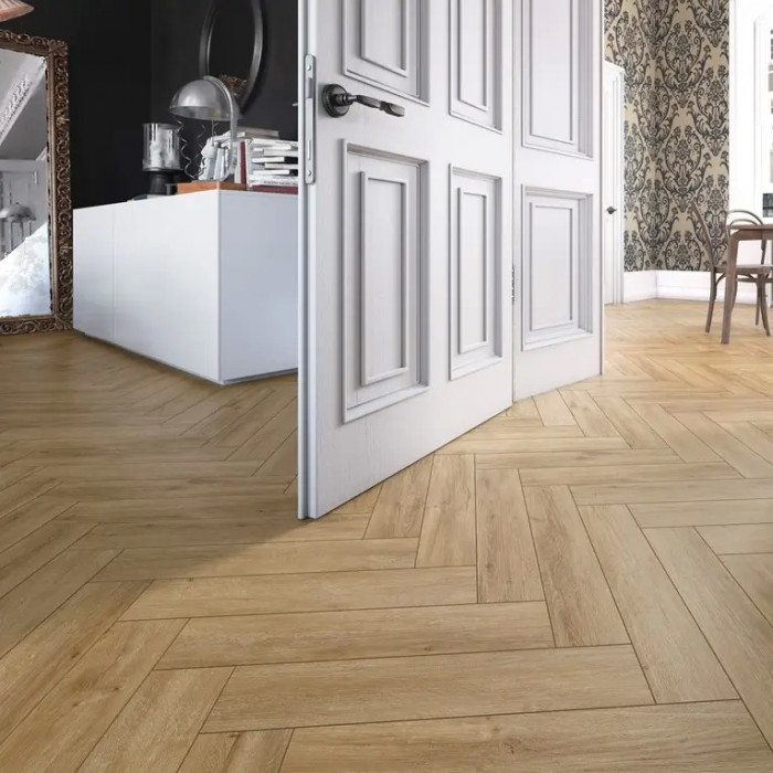 Декори колекції Carmelita при укладанні утворюють малюнок Herringbone, тобто. дизайн під англійську ялинку з тисненою текстурою під дерево з 4V-фаскою. Однак його можна укладати і класичним палубним способом, комбінуючи різні кольори однієї колекції.