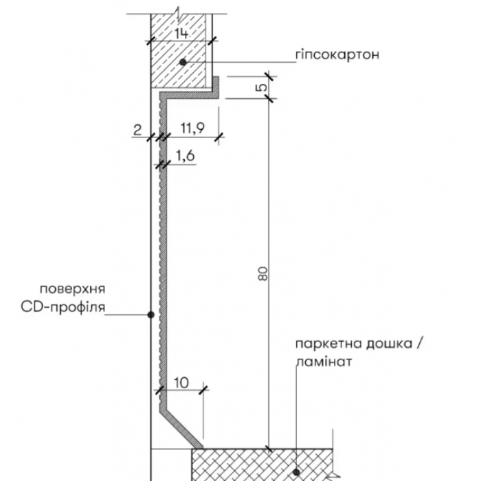 Мінімально помітний алюмінієвий профіль для оформлення стику стін та підлогового покриття або прихований плінтус, тіньовий шов. left:0cm; margin-right:0cm;text-align:start">Ця модель плінтусів створює тіньовий шов уздовж лінії примикання стін та підлоги.